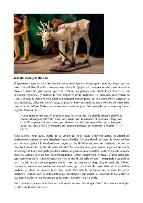 Pour ce spectacle Emilie Flacher et son équipe créent un dispositif scénique qui mêle jeu d’acteur·ice·s et de marionnettes afin de nous faire glisser de strates en strates. En explorant la technique ancienne de la marionnette à fil long hybridée avec la machinerie théâtrale, ils nous font vivre de manière chorale cette histoire singulière comme pour nous en donner son aspect universel : nous sommes tous·tes des Lucy Afarensis coincées dans une strate du temps et nous sommes tous·tes des spécimens ouverts à d’autres mondes possibles.